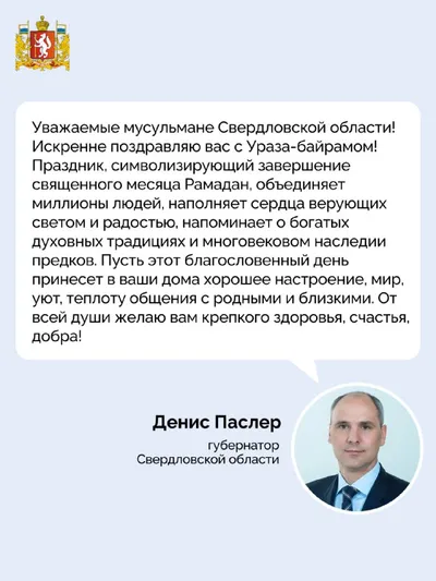 📃✨Денис Паслер поздравил мусульман с праздником Ураза-байрам, который в этом году отмечается 20 марта. Глава региона отметил, что мусульманские общины Свердловской области вносят большой вклад в раз