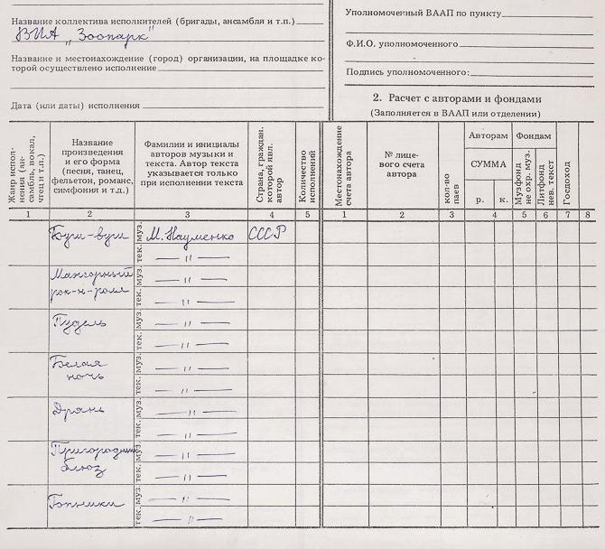 Документ, заполненный Майком для отчетности. Названия песен и все такое. Например, «ВИА Зоопарк». Ну а как вы хотели.