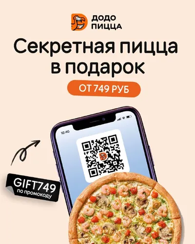 Соберите заказ от 749 руб и получите пиццу в подарок. Какую? Узнаете, когда сделаете заказ😉 Это может быть любимая классика или что-то неожиданное. Чтобы узнать, используйте промокод GIFT749 при о