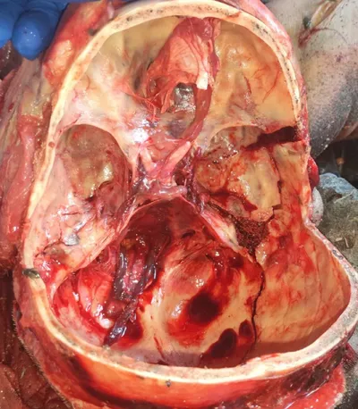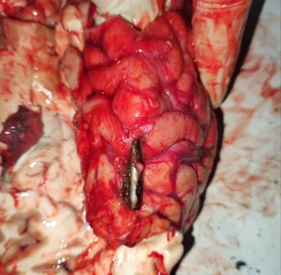 Кто-то просил продублировать запись, скидываю по просьбе. Огнестрельное слепое пулевое ранение головы. Калибр 5,45. Как видите, сердечник пули в одном месте, оболочка в другом. Разумеется 200й. @mi