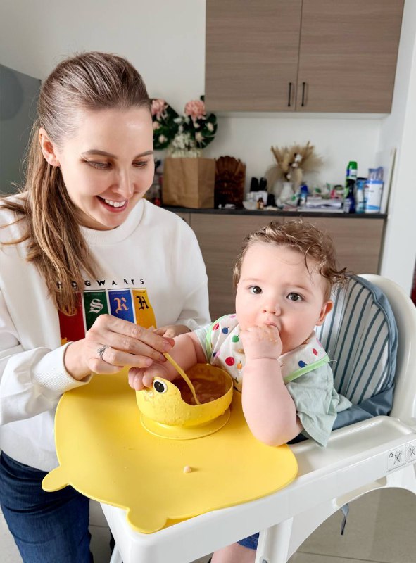 Мой малышоночек начал прикорм ☺️ сначала пососал грушу, и три дня ест пюре из персика. Дальше идем за бананом. Поверить не могу. 6 месяцев назад он был еще в животе, а сейчас пытается надеть тарелку