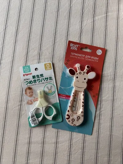 Принадлежности по уходу за ребенком Ножницы для ногтей- с закругленными краями, для безопасности. Сами лезвия короткие, что должно быть тоже удобно при подстригании ногтей) Термометр для воды- безрт