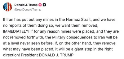 Трамп требует у Ирана убрать мины в Ормузском проливе если они действительно были установлены, а иначе... размолотят еще какую-нибудь школу.