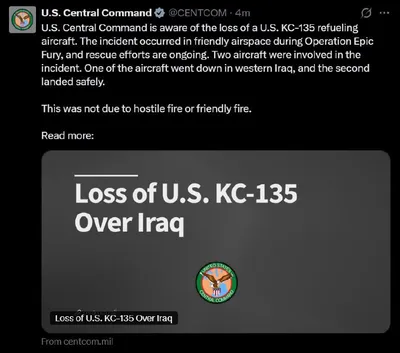 🇺🇸🏴☠️ В ходе операции "Эпическая ярость" потерян самолет-заправщик Stratotanker KC-135 ВВС США ▪️Военный Boeing KC-135 разбился на территории дружественной страны. ▪️Центральное командование США
