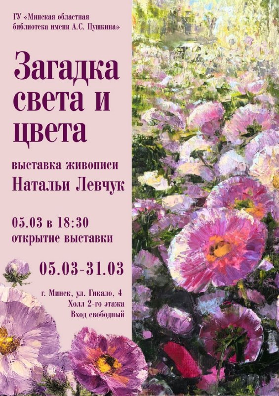 Персональная выставка живописи Натальи Левчук «Загадка света и цвета» ⏰С 5 по 31 марта; открытие 5 марта в 18:30; далее пн-чт с 12:00 до 20:00; сб и вс с 10:00 до 18:00 📍Минская областная библиотека
