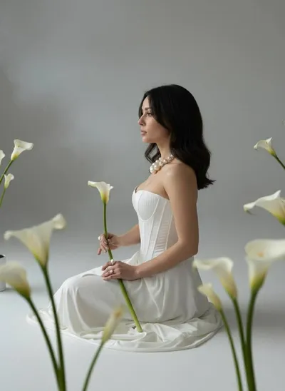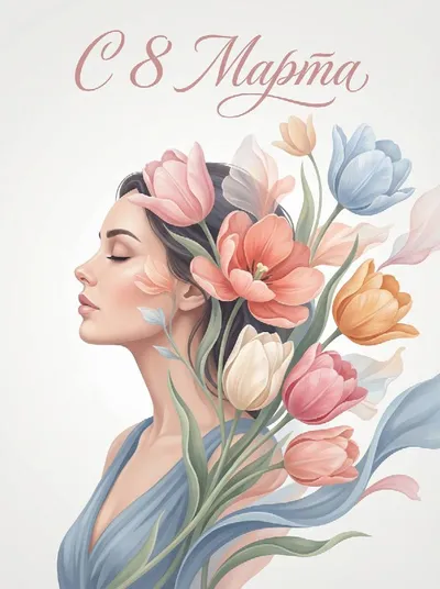 Открытка к 8 марта с вашим портретом Elegant contemporary digital illustration of a woman in profile facing left, eyes gently closed, with delicate facial features emerging into flowing botanical for