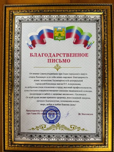 Совет старейшин Хасавюрта отметил работу руководства ЦГБ 🏔️ Сегодня в торжественной обстановке Председатель Совета старейшин города Хасавюрт Шамсулгуда Магомедов вручил благодарственное письмо глав