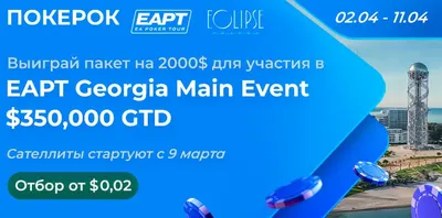 Занимательный факт: Отобраться на EAPT Грузия можно по цене банкролла омахабота - 0.02$ Сателлиты начались в день рождения Юрия Гагарина и куклы Барби - 9 марта. Шанс пройти все сателлиты с $0.02 ->
