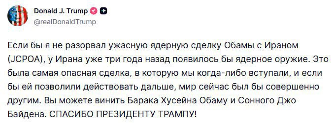 Трамп выставляет обвинения в адрес Обамы и Байдена, утверждая, что Иран мог бы обладать ядерным оружием уже три года назад. Он пояснил, что если бы не его решение выйти из ядерной сделки, заключенной