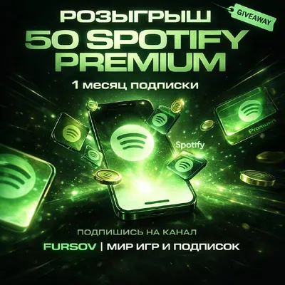 🎁 Разыгрываем 50 подписок Spotify Premium на 1 месяц ✔️ Для участия: Подпишись на @fursov Итоги уже 15 марта в 13:00 Не хочешь ждать? 💵 Подключай Spotify прямо сейчас на fursov.me — от 299₽ в м