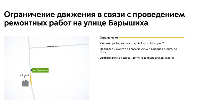 ❗️Сегодня (2 марта) и до 1 августа на участке улицы Барышихи будет недоступна для движения 1 полоса. 🛠Это связано с проведением ремонтных работ. Митино в MAX | Телеграм ⠀⠀📨Прислать новость