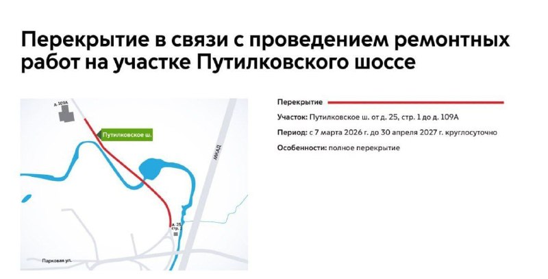 ❗️В субботу (7 марта) мост через реку Сходня на Путилковском шоссе будет перекрыт более чем на год ✖️С 7 марта 2026 г. до 30 апреля 2027 г. участок Путилковского шоссе будет закрыт для проезда. 🛠Э