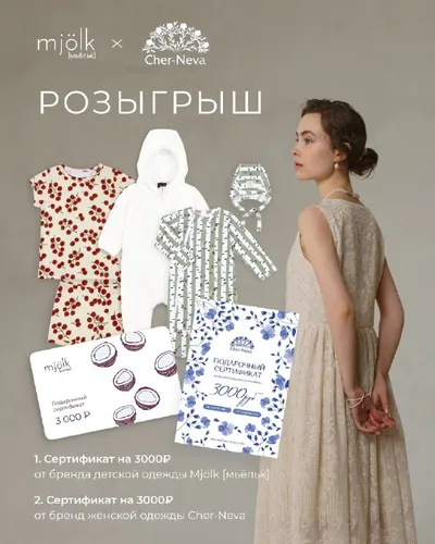 Розыгрыш от Cher~Neva и Mjölk для милых мам и их малышей ☀️ ⠀ Мы объединились с брендом @cher_neva, чтобы порадовать вас приятными подарками 💝 ⠀ Дарим: ✨ Сертификат на 3000₽ от Cher~Neva ✨ Сертификат