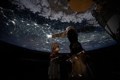 На снимке, сделанном с Международной космической станции над Аравийским морем и Гималаями, запечатлен хорошо освещенный ночной городской пейзаж Индии.