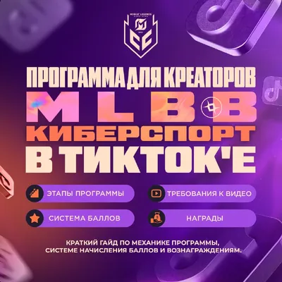 ⭐️ Присоединяйся к программе для креаторов! Публикуй контент по киберспорту MLBB в 📱 TikTok, зарабатывай баллы и получай награды. ⭐️ Программа поощряет системную работу с контентом в течение всего