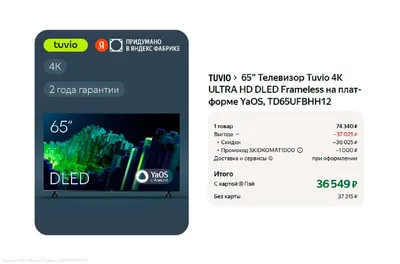 🤔 65-дюймовый 4К-телевизор за 36 тысяч Tuvio TD65UFBHH12 Cтарая цена — 54.400₽ Новая цена — 36.549₽ (с кодом SKIDKOMAT1000) Товар по ссылке Цена товара может отличаться, размер скидки зависит от
