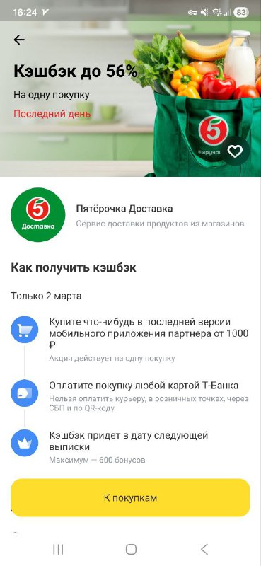 Не знаю, есть ли у вас такая акция. Тинькоф даёт скидку до 56% на доставку в пятёрочке 🎁 Больше халявы в боте