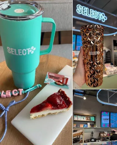 В московских «Select Перекрёстках» появился свежий мерч — и он реально стильный🤌🏼 В коллекции: золотистый стакан с геометрическим рельефом, мятный термостакан для горячих напитков и яркий фирменный