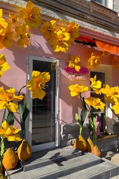 🌼 Весенняя фотозона на Патриках У Omg Coffee снова расцвёл фасад — вход украсили гигантскими нарциссами, пасхальными кроликами и розовыми столиками. Получилась очень уютная и фотогеничная локация.