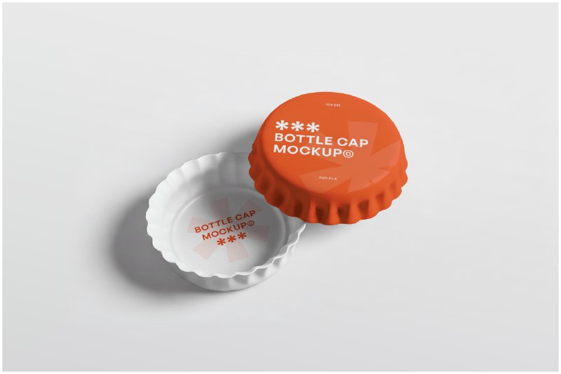 Bottle Cap Mockup Три композиции с металлическими крышками от бутылок: вид сверху, под углом и в стопке. Видны текстура металла и рельеф. Используется для презентации брендинга напитков, пивоварен и