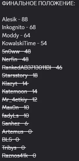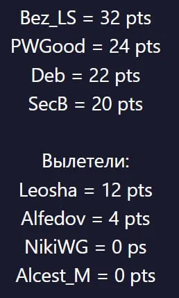 ИТОГИ КВАЛИФИКАЦИИ: 1. Bez_LS = 32 pts 2. PWGood = 24 pts 3. Deb = 22 pts 4. SecB = 20 pts Завтра смотрим уже сам плей-офф (полуфиналы, матч за 3-ое место и финал). ПОЛУФИНАЛЫ следующие: 1. Bez_LS