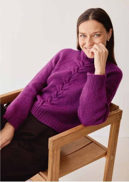 Свитер Модель украшена вертикальными косами и жгутами. В центральной части деталей простые, но эффектные теневые ромбы.