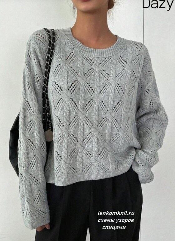 Светло-серый пуловер с интересным узором.Это ромбы с тройным ажурным контуром и жгутами.