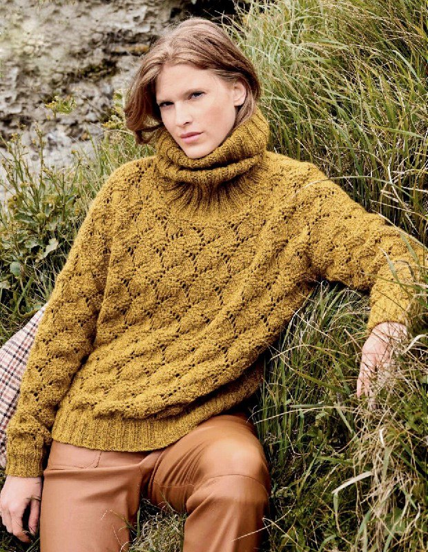 Размеры: 36/38 (40/42) 44/46. Для вязания нам потребуется 550 (550) 600 г горчично-желтой пряжи: 90% шерсть альпака, 5% овечья шерсть, 5% полиамид; 140 м/50 г. Спицы № 4,5 и 6. А также круговые спицы