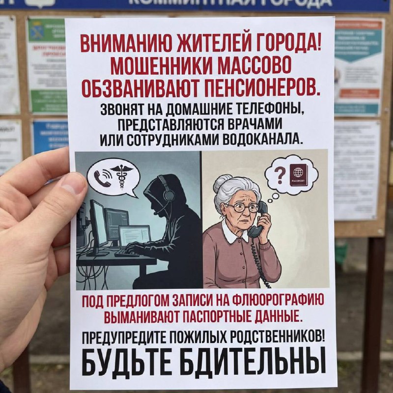 ⚡️Вниманию жителей города! Мошенники массово обзванивают пенсионеров. Звонят и представляются врачами или сотрудниками водоканала. Под предлогом записи на флюорографию выманивают паспортные данные.