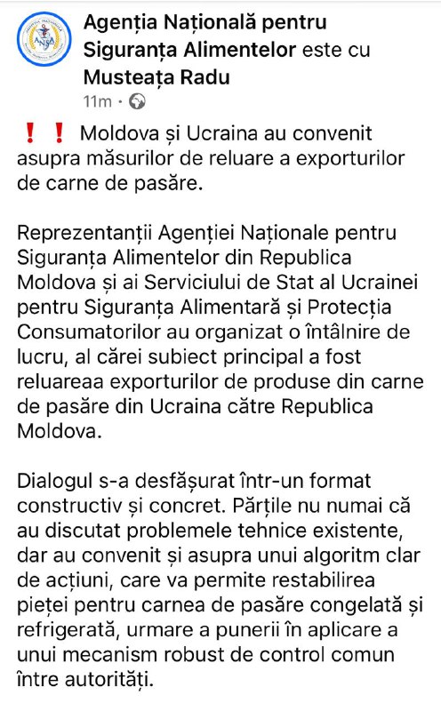 Молдова и Украина договорились возобновить экспорт мяса птицы Представители Агентства по безопасности пищевых продуктов Молдовы и их украинские коллеги провели рабочую встречу и согласовали меры для