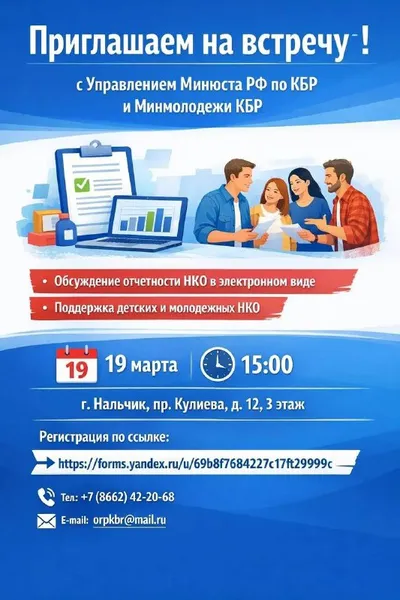 Друзья, приглашаем вас на встречу с представителями Управления Минюста РФ по КБР и Минмолодежи КБР. В рамках мероприятия обсудим вопросы предоставления отчетности некоммерческих организаций в электро