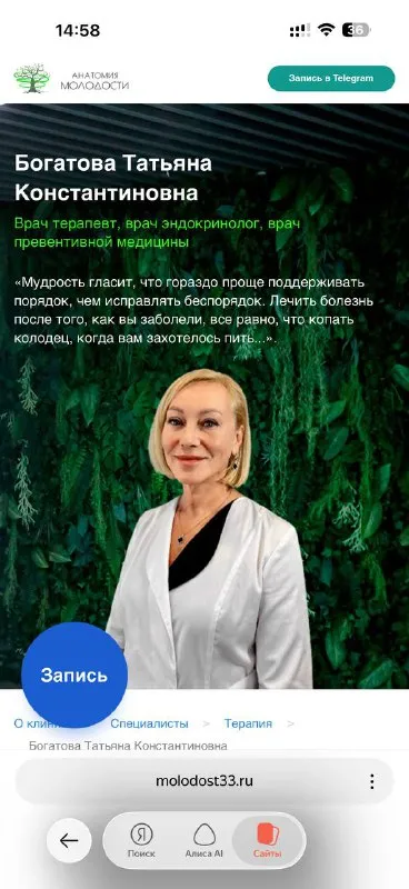 Она очень крутая, с ней люди прям на глазах худеют , это если что касается питания. Но я пойду по другому вопросу, сами знаете по какому😂 https://molodost33.ru/bogatova-tatyana-konstantinovna?yscli
