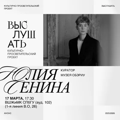 💬💬💬💬Встреча «Выслушать» пройдет 17 марта с куратором Музея ОБЭРИУ Юлией Сениной! Поговорим про то, как создавался Музей ОБЭРИУ и почему обэриуты сегодня так актуальны, что для Юлии значит куратор