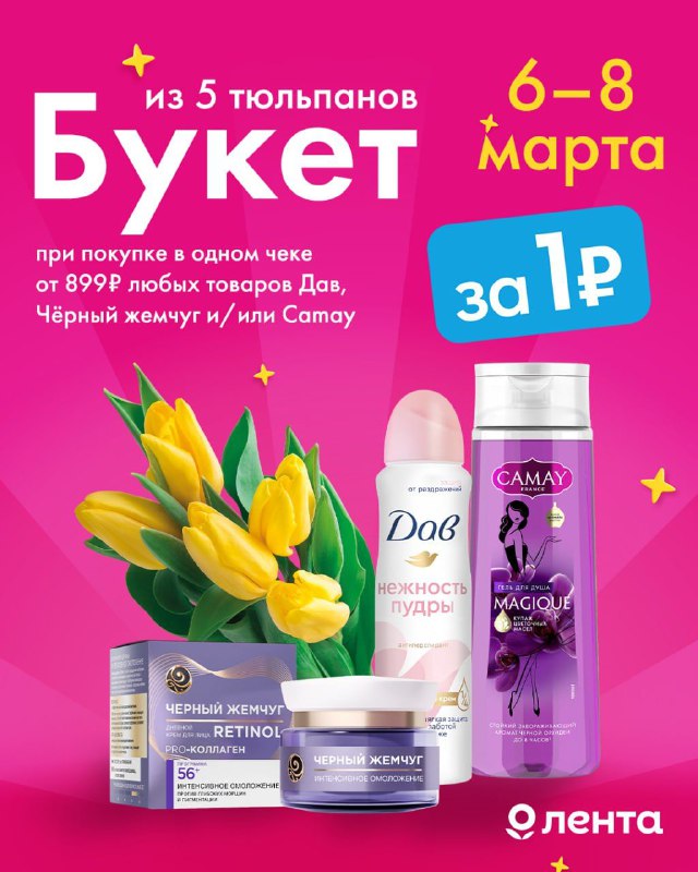 Букет из 5 тюльпанов всего за 1₽ в магазине Лента 🗓6-8 марта 🌎во всех магазинах "Лента" АКЦИЯ ТАКАЯ: 👉Выбрав в магазине «Лента» товары брендов: «Дав», «Чёрный жемчуг», Camay на сумму от 899₽ в