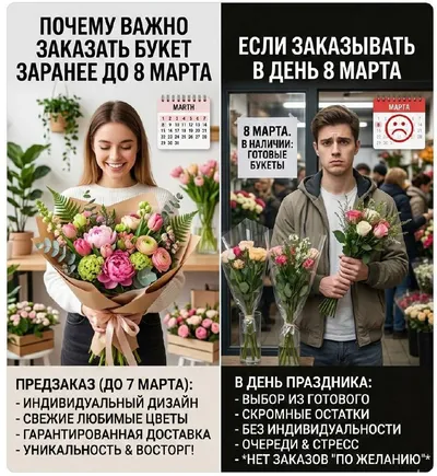 Дорогие наши подписчики! 💐 8 Марта уже близко! 🌷 Чтобы ваши любимые женщины получили букет мечты и испытали настоящее счастье, пожалуйста, сделайте заказ ЗАРАНЕЕ! 🗓️ Чем раньше вы закажете, тем бо