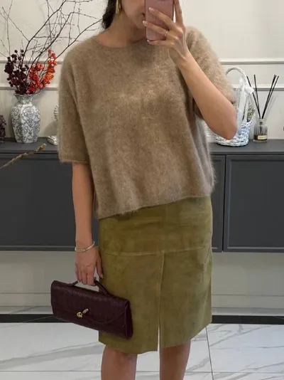 Одна юбка — два решения🤍 Именно так предлагает стилизовать наши бестселлеры Светлана, которая выбирает юбку из 100% натуральной замши в дуэте с джемпером для теплых дней или кардиганом из 100% преми