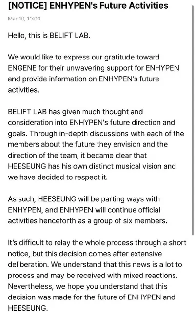 Мы просто в шоке, если честно и не знаем, как реагировать Хисын уходит из ENHYPEN и группа продолжит продвигаться в составе из 6 человек.