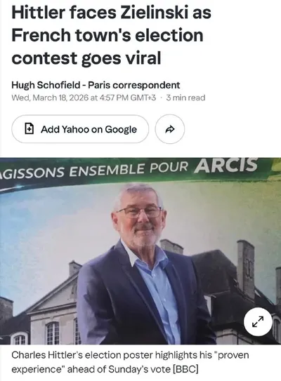 Гитлер победил Зеленского на выборах. Первый тур муниципальных выборов прошёл во французском городке Арси-сюр-Об. Действующий мэр Charles Hittler набрал 38% голосов, Antoine Renault-Zielinski — 30%.