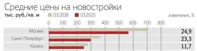 За год средняя стоимость квадратного метра в московской новостройке выросла почти на 25%, до более чем ₽700 тысяч. Это рекордный уровень среди всех крупных городов России.