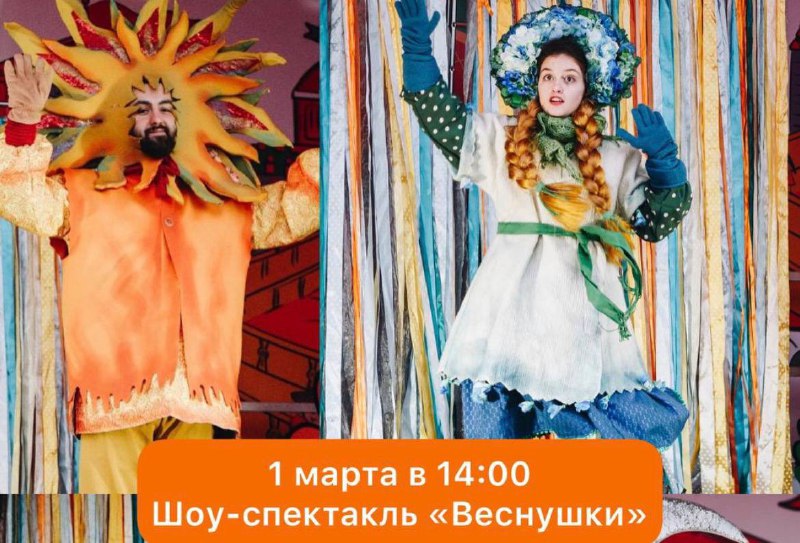 🎭Афиша спектаклей марта в ТП «Отрада». 💰Вход свободный 📍Пятницкое ш., 1, стр. 1, п. г. т. Отрадное (этаж 1). ✅ 1 марта в 14:00 — Шоу-спектакль «Веснушки». История о приходе весны и кознях злод