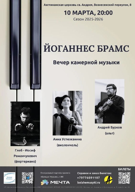 ЧТО: Иоганнес Брамс. Вечер камерной музыки✨ ГДЕ: Англиканская церковь Св. Андрея, Вознесенский пер., 8/5 КОГДА: 10 марта, 20:00 Один из ярчайших представителей эпохи романтизма — немецкий композитор