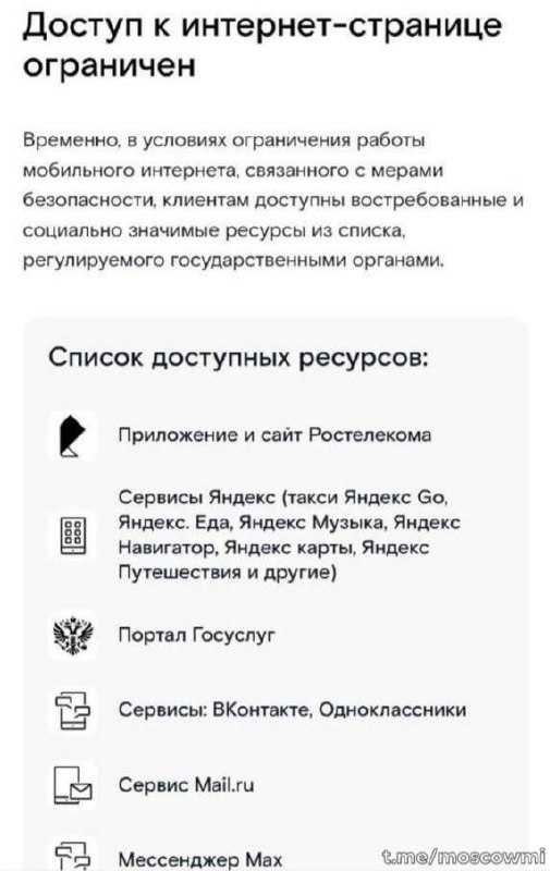 ❗️ В Москве работают только 4 сервиса. Отключения мобильного интернета в столице длятся уже пять дней. В белых списках доступны только сервисы: VK и Яндекса, Госуслуги и госмессенджер MAX.
