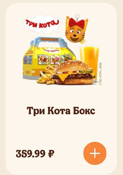 🤤 В Бургер Кинг завезли бокс по мультику «Три Кота» В комбо игрушки в виде Коржика, Компота и Карамельки. Внутри — бургер, картофель, напиток и мягкая игрушка с котиком. Всего в коллекции 8 котят,