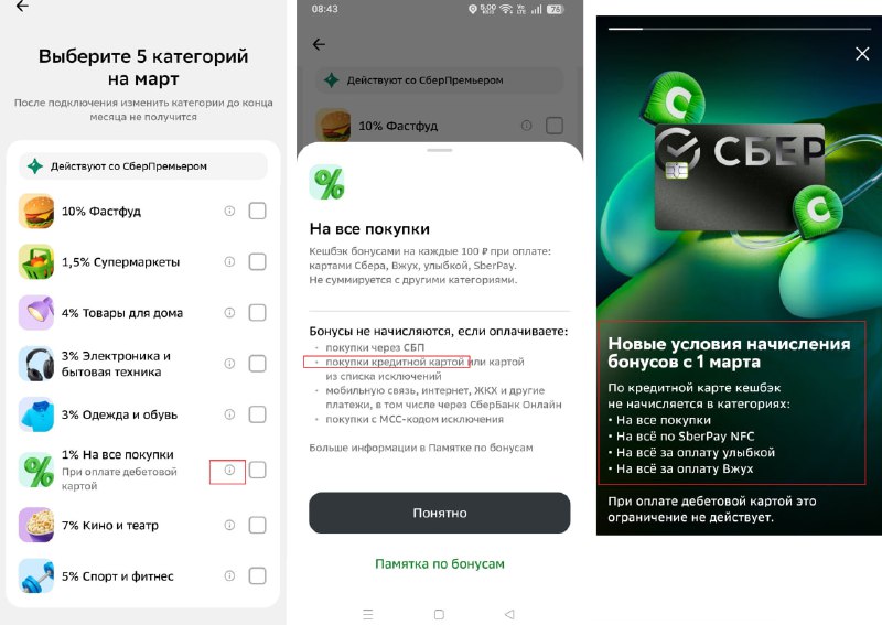 💳 Кэшбэк с 1 марта Сбер дал выбор категорий кэшбэка с 1 марта. Но и подтвердились слухи по ограничению кэшбэка при оплате кредитной картой в категории все покупки, а также через SberPay NFC, улыбко