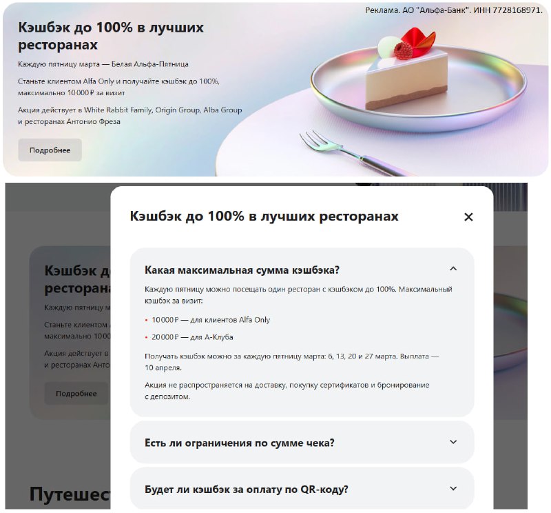 💳 Alfa Only и А-Клуб: 100% кэшбэк в ресторанах по пятницам в марте Альфа-Банк для премиальных клиентов (Alfa Only и А-Клуб) проводит акцию «Кэшбэк до 100% в ресторанах». Суть: по пятницам в марте (6
