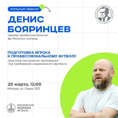 😆 Семинар с Денисом Бояринцевым Центр им. К. И. Бескова проводит очный семинар для тренеров, работающих в детско-юношеском футболе. Спикер – Денис Константинович Бояринцев, экс-футболист сборной Рос