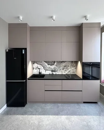🔥 Как сделать кухню «дорогой» , но спокойно и практично? На фото — пример, который часто выбирают для современных квартир: матовый серо‑бежевый + высокий пенал/колонна в дереве + минимум деталей. Вы