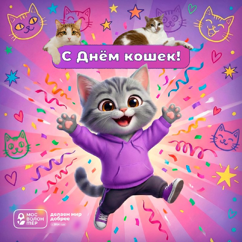 Поздравь своего питомца с Днём кошек! Пусть сегодня их ждут самые вкусные угощения и любимые игры! А если у тебя нет кошки, ты можешь навестить мурок в приюте. Делись в комментариях, как вы отмечает