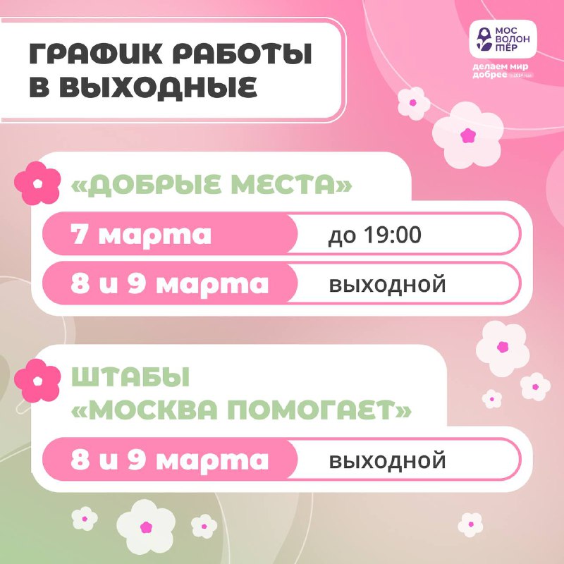 ⚡️Тебе точно надо это прочитать⚡️ Весна, цветы и длинные выходные ☺️ Чтобы наши планы совпали, ознакомься с графиком работы в праздники. ↪️ Сохраняй расписание «Добрых мест» и штабов «Москва помогае