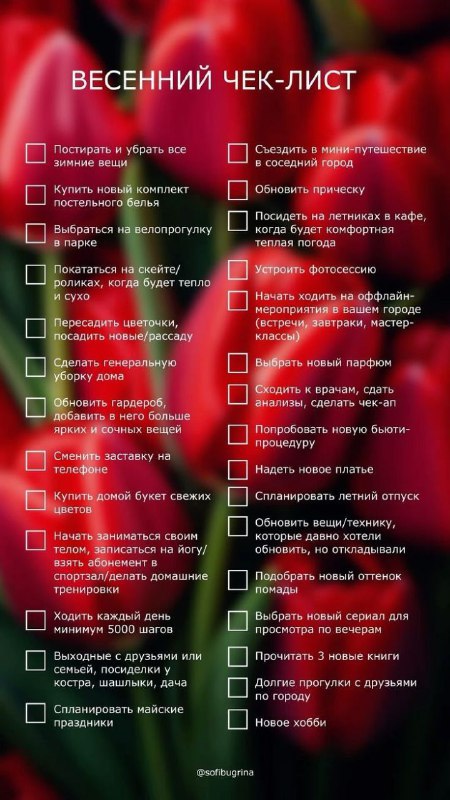 Весенний чек-лист С 1 днём весны,товарищи! Ура!!! 🌹 Сразу дышать стало легче и жить веселее! Солнце ярче и дни длинее! Наполним жизнь ещё прекрасными планами, о которых могли и забыть😘 БОНУС ДНЯ